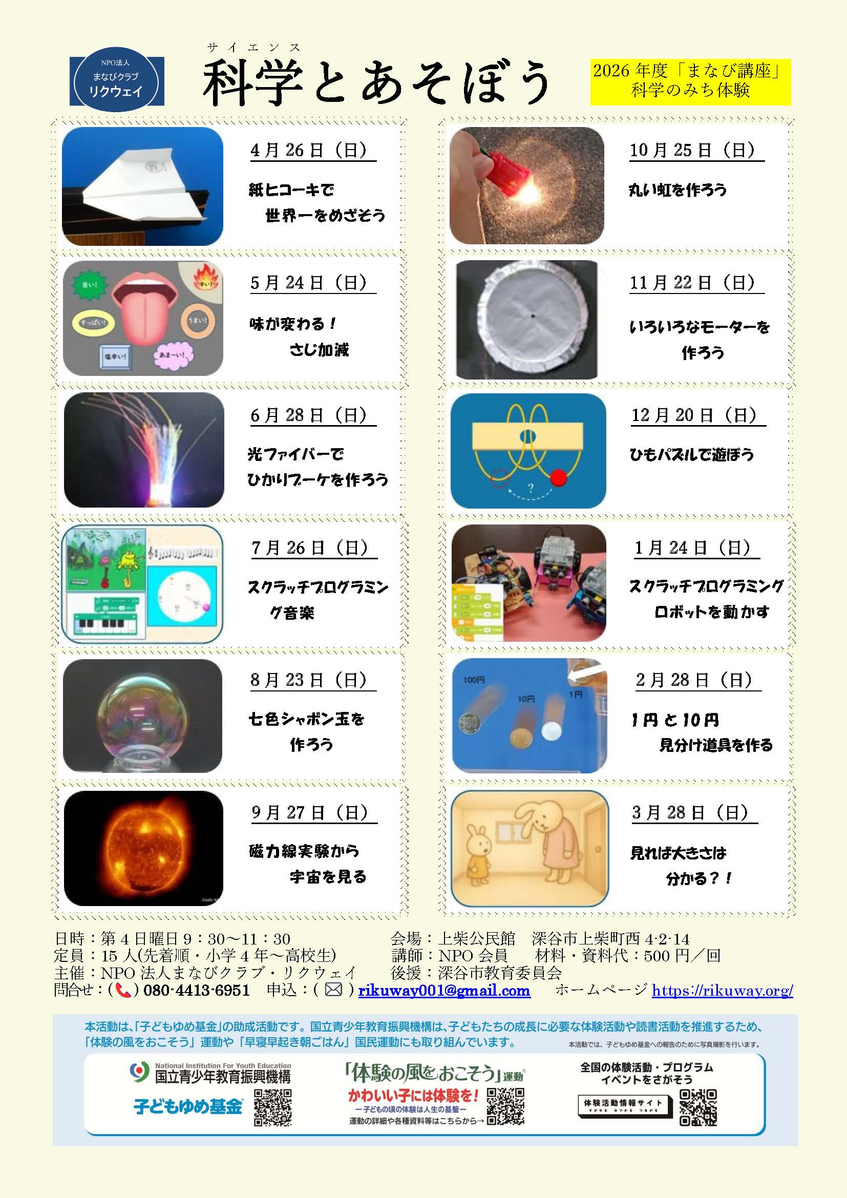 4月26日(日) 9:30 上柴公民館・体育館 滞空時間型と飛距離型の違いを体験 ①飛ばして滞空時間と飛距離を測る ②風洞実験で空気の流れを確かめる ③形による違いを理解する |